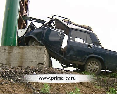 «ВАЗ 2105» со всего маху влетел в рекламную стойку автозаправочной станции. Трое пассажиров чудом остались живы, а вот машина восстановлению не подлежит.