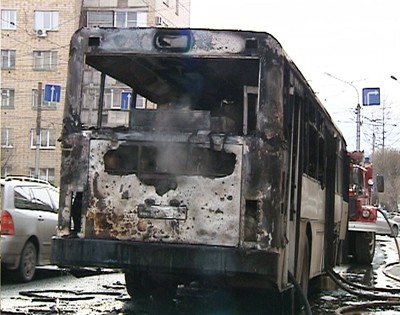 Час назад на улице Ленина около остановки Агропром практически полностью сгорел пассажирский автобус пятого маршрута.