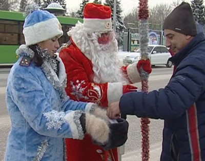 В костюмах Деда Мороза и снегурочки они сегодня останавливали машины возле Центрального парка.