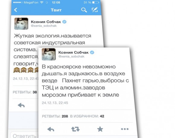 Известная телеведущая чуть не задохнулась в нашем городе. Так она сама уверяла накануне. Она приехала, чтобы записать интервью с участницами Pussy Riot для телеканала «Дождь». Визит был коротким, утром журналистка улетела в Москву. А вот ее твиты о плохой экологии Сибири теперь гуляют по сети. Ксения Собчак посочувствовала красноярцам в том, что приходится дышать грязным воздухом. Одни остались благодарны светской львице за «правду нелегкой жизни», другие, напротив, обиделись на критику и пожелали оставаться впредь в Москве.