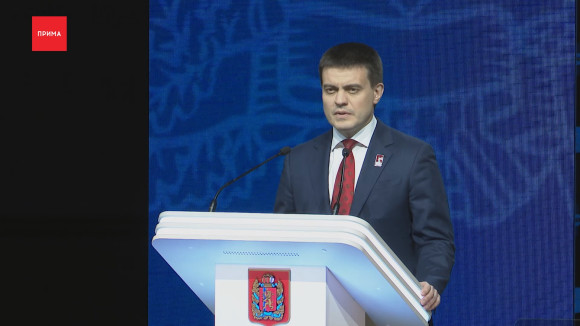 В большом концертном зале сегодня чиновники, депутаты, главы городов. Даже новый Митрополит пришел послушать ежегодный доклад Губернатора. На сцене — Михаил Котюков — рассказывает, что сделано и какие проекты впереди.