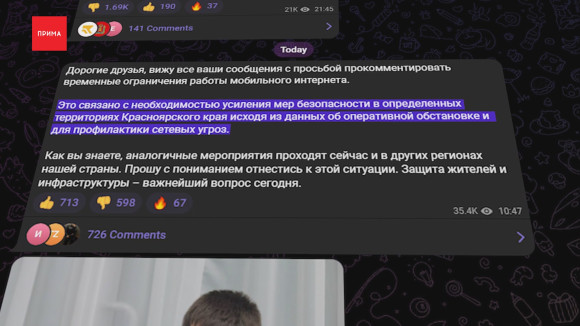 Четвертые сутки Красноярск живёт без мобильного интернета. Сегодня, наконец, свой комментарий дал губернатор края Михаил Котюков. Руководитель региона пояснил, что интернет отключен для защиты жителей и инфраструктуры.