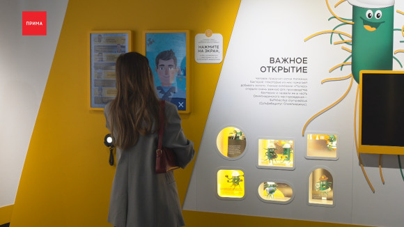 — В экспозиции всё нужно пробовать и трогать. Например, здесь узнаем, как с помощью пузырьков воздуха и пены извлекается золото. А вот здесь слышны звуки производства. Слышите? Золотишко звенит!
