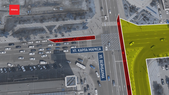 Ограничения на оживленном перекрёстке Маркса — Вейнбаума пройдут в два этапа. Первый начнется уже в эту субботу — 16 августа. Так, закрывают часть крайней левой полосы на Маркса — там выносят сети холодного водоснабжения. А вот на Вейнбаума перекрывают крайнюю правую полосу — ту, что идет вдоль строительства станции метротрамвая.