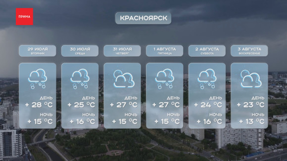 Рабочая неделя будет по большей части дождливой. В ночь на вторник +15°C, небольшие осадки, днем распогодится до +28°C. Ветер юго-восточный, 5–9 метров в секунду. Почти такие же градусы ожидаются в среду, но дождь усилится. Воздух прогреется максимум до +25°C. В среду днем уже +27°C, и предварительно — без осадков, переменная облачность. Летние тропики ожидаем и в четверг, 31 июля: +15°C ночью, +26°C днем. Ближе к выходным — похолодает. В субботу, 2 августа, +24°C, и снова возможен проливной дождь. Ночь на воскресенье станет самой холодной — +13°C. Днем +23°C и без осадков.
