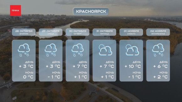 Предстоящей ночью ожидаем снег с дождём. Небольшие осадки обещают синоптики и днём во вторник. Температура в районе +3 °C. Такой же прогноз дают и на среду: ночью −1 °C, днём +3 °C. Чуть теплее в четверг, 30 октября — распогодится до +7 °C, и, возможно, снова пойдёт дождь. В пятницу — уже без осадков, облачно и +7 °C. Неожиданно теплеть начнёт в первых числах ноября: в субботу рекордные на неделе +10 °C, облачно с прояснениями. Жаль, что официально это рабочий день. В воскресенье — снег с дождём и похолодание до +6 °C.