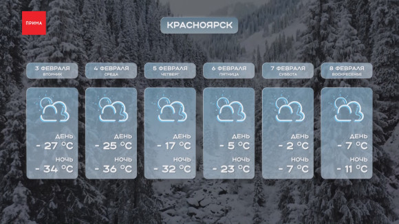 Если накануне днём воздух прогрелся до −4 °C, то уже сегодня было −18 °C. В предстоящую ночь столбики термометров опустятся ещё ниже — до −34 °C. Завтра в светлое время суток — −27 °C; будет переменная облачность, но без осадков. Среда и четверг — самые холодные дни недели: по ночам до −36 °C. Начиная с пятницы в Красноярск начнёт постепенно возвращаться тепло. Ночью — −23 °C, а днём — приятные −5 °C. Похожая погода ожидается и в выходные: до −2 °C в субботу и до −7 °C — в воскресенье днём.