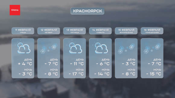 В светлое время суток — плюс 4 °C, да и в ночь на среду — всего −3 °C. Начиная с четверга снова холодает. Из плюса сразу ударимся в ночные −8 °C. Днём в четверг, 12 февраля, −7 °C, облачно, без осадков. Серьёзно подморозит в пятницу. Ночью — крепкие −17 °C, днём немного теплее — −11 °C. Суббота и воскресенье приятно порадуют всех, кто любит прогулки: до −6 °C днём. Ночью снова — до −14 °C. Начало следующей рабочей недели тоже будет по‑зимнему морозным: никакой оттепели. В ночь на понедельник, 16 февраля, −15 °C. Днём не теплее −7 °C: облачно и снежно.
