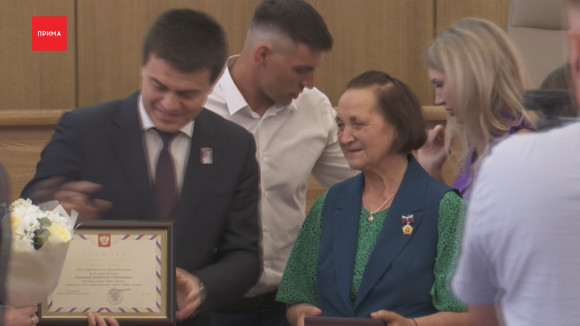 Праздничные мотивы духового оркестра звучат в большом зале краевого правительства. Здесь проходит вручение государственных и краевых наград. Антонида Акинина стала первой жительницей Красноярского края, удостоенной знака «Мать-героиня» в современной России. В её семье 13 родных детей, из них 7 сыновей и 6 дочерей, и уже 30 внуков и 3 правнука.