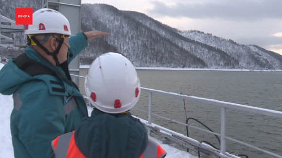 — Понял, да. Первая задача — обеспечение водоснабжения Красноярска, но при обязательной выработке электроэнергии. Нужно, чтобы река Енисей работала на определённом уровне. Вот видишь, по берегу белая полоса — столько мы можем поднять, чтобы обеспечивать в течение года город Красноярск.